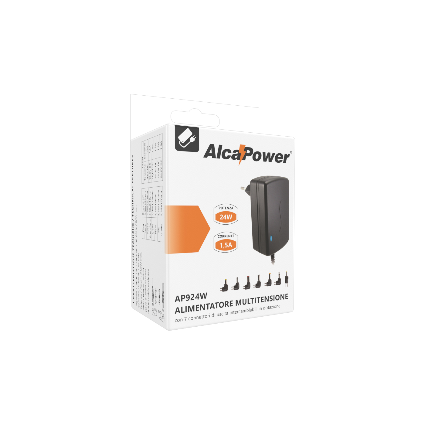 - Uscite: 9,0V DC 1,5A 13,5W; 12,0V DC 1,5A 18,0W; 15,0V DC 1,5A 22,5W; 18,0V DC 1,2A 21,6W; 20,0V DC 1,2A 24W; 24,0V DC 1,0A 24W;