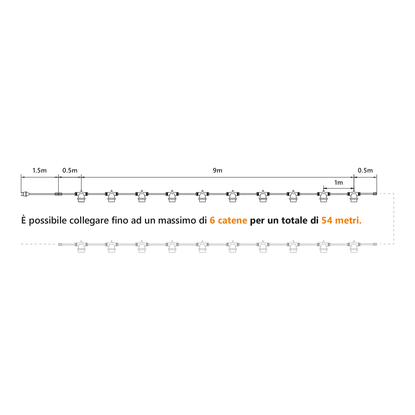 Si possono collegare fino a 6 catene per un totale di 54m e una potenza massima di 1000W.