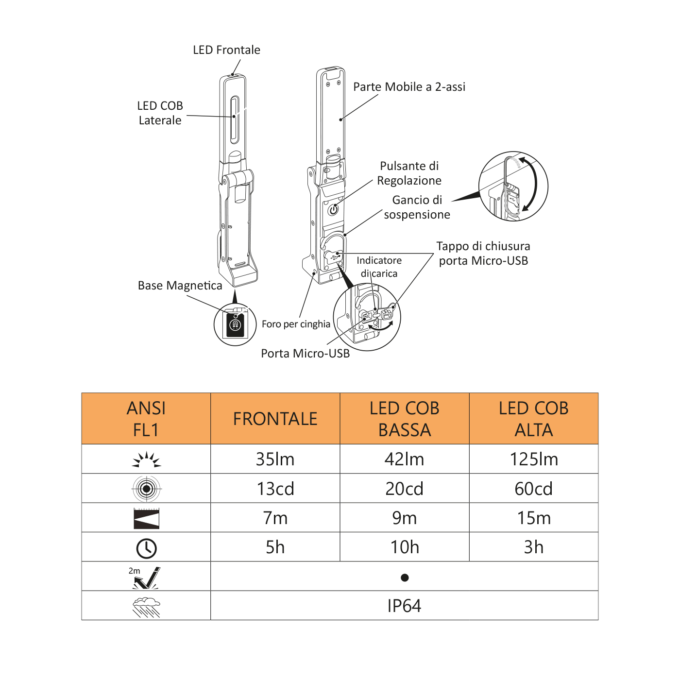 - Luce laterale: LED COB da 125lm, ideale per luce direzionale.