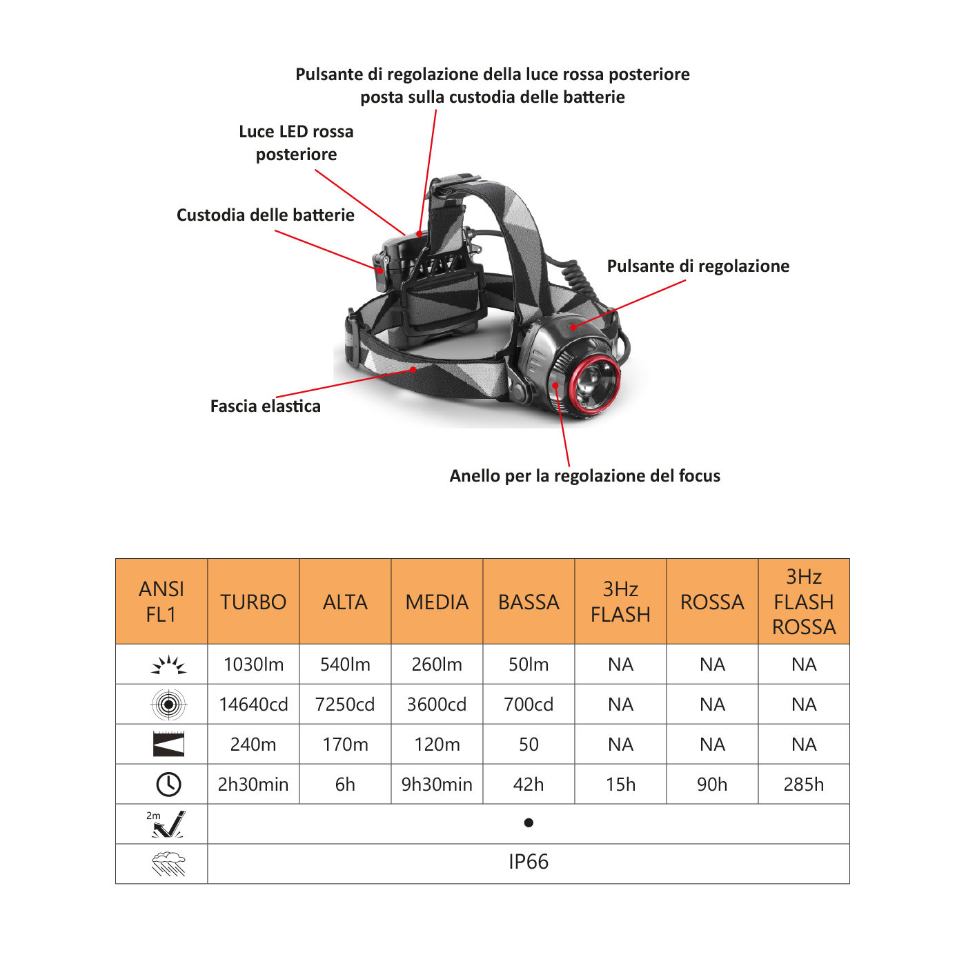 - Luce LED rossa di segnalamento sulla parte posteriore della fascia elastica da testa con due modalità di funzionamento: accesa fissa e 2Hz FLASH.