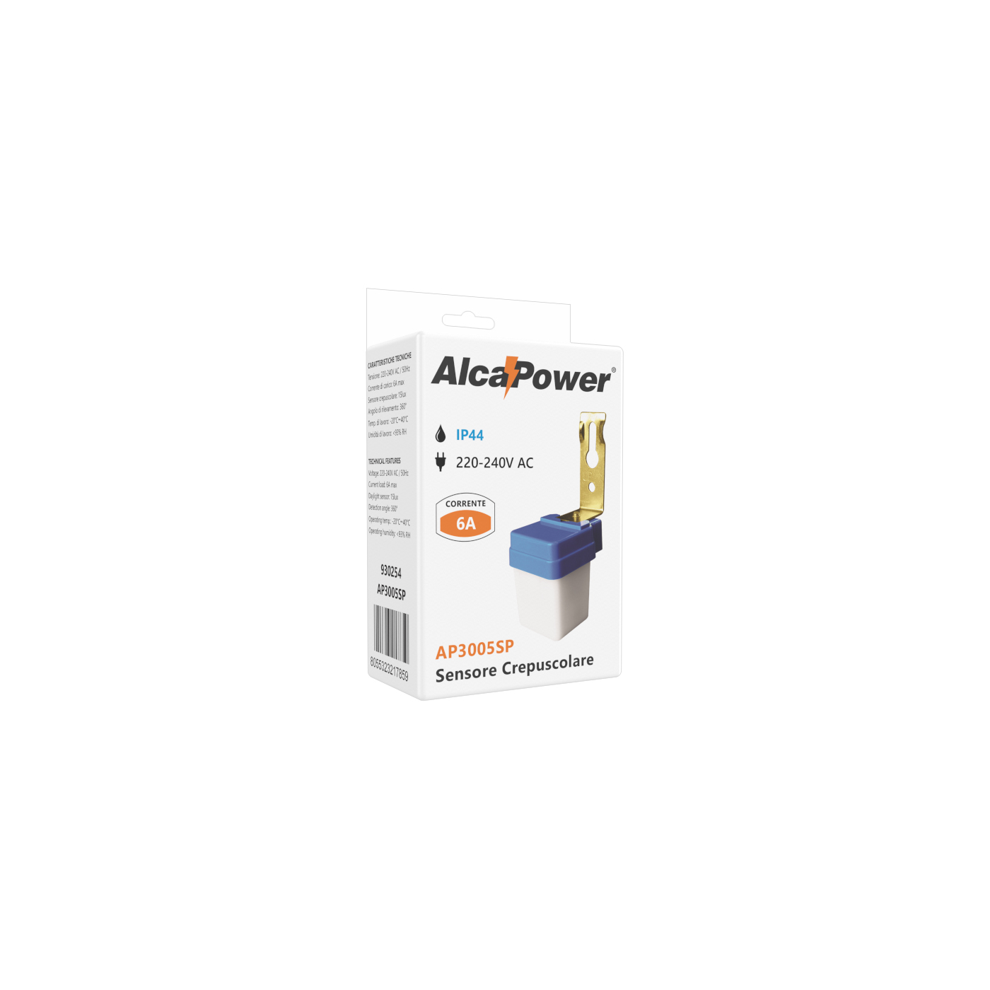 - Ingresso: 230V AC 50Hz, - Carico massimo: 6A. - Soglia sensore crepuscolare: 15lux. - Temperatura di lavoro: da -20°C a 40°C. - Umidità di lavoro: <93%RH. - Peso: 49g.