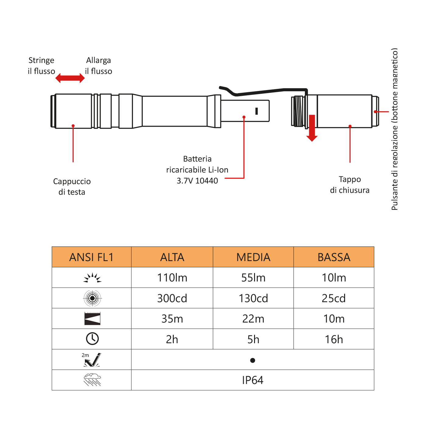 - Durata media della batteria con torcia accesa alla massima luminosità: 2 ore.