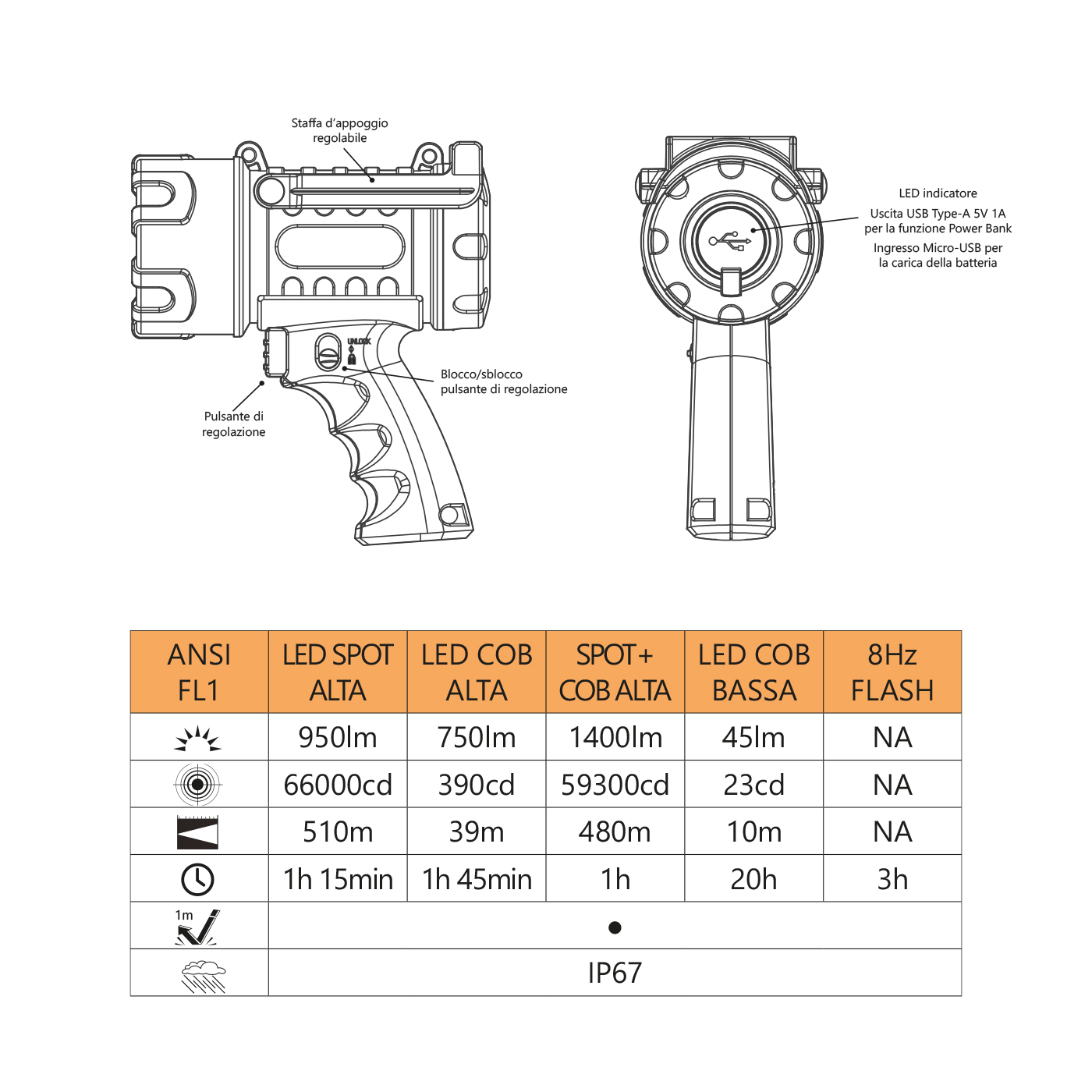 - 5 modalità di funzionamento: LED SPOT ALTA, LED COB ALTA, SPOT+COB ALTA, LED COB BASSA e 8Hz FLASH.